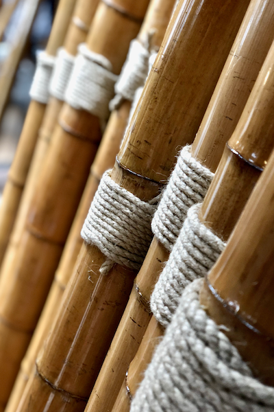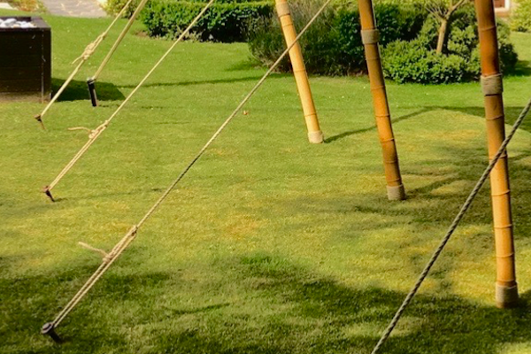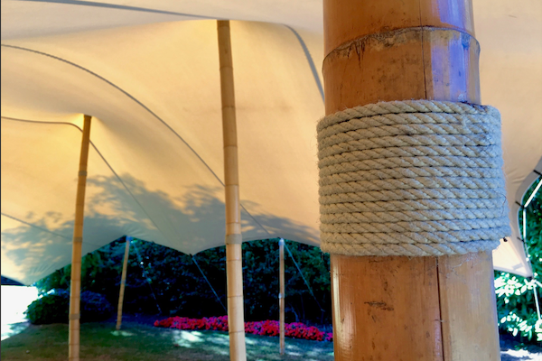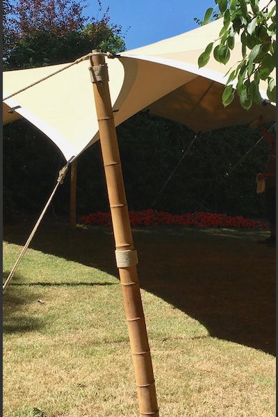 La toiture d'une tente stretch TAMBOO est soutenue par des mâts ou poteaux sous la tente et en périphérie de celle-ci. Des points hauts et des points bas doivent être judicieusement placés afin de permettre l’écoulement des eaux de pluies et d’obtenir le meilleur design. Les mâts en bambou de qualité supérieure sont de véritable éléments de décors préservant l'aspect naturel et boheme du produit. Arrivant à l'état brut chez Nord Baches , nous les transformons sur place dans nos ateliers en les traitant contre les agressions exterieures et contre l'effet de fissures. Nous le préparons aussi à recevoir une coupole de protection avec un axe en nylon solidement fixé.