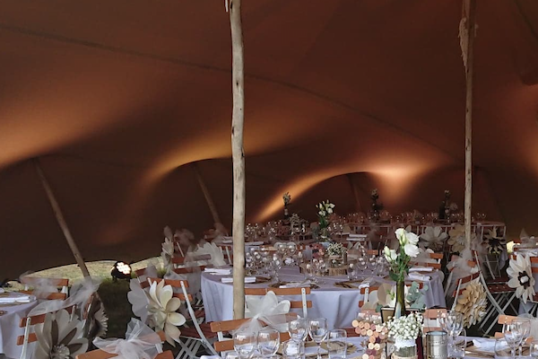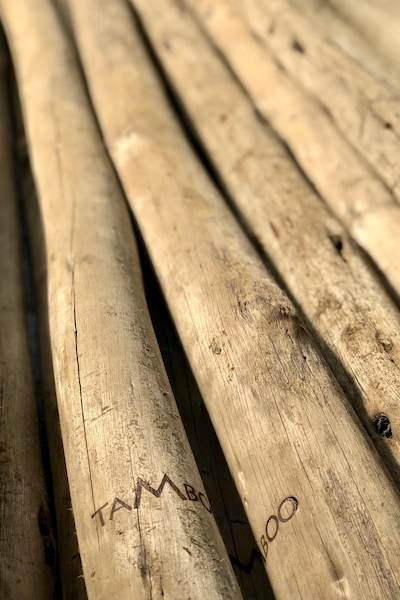 La toiture d'une tente stretch TAMBOO est soutenue par des mâts ou poteaux sous la tente et en périphérie de celle-ci. Des points hauts et des points bas doivent être judicieusement placés afin de permettre l’écoulement des eaux de pluies et d’obtenir le meilleur design. Les mâts en Eucalyptus sont robustes et très agréables au regard et au toucher. Avec leur présentation non transformé Ils préservent l'aspect naturel et boheme du produit. Arrivant à l'état brut chez Nord Baches nous le préparons juste à recevoir une coupole de protection avec un axe en nylon solidement fixé.